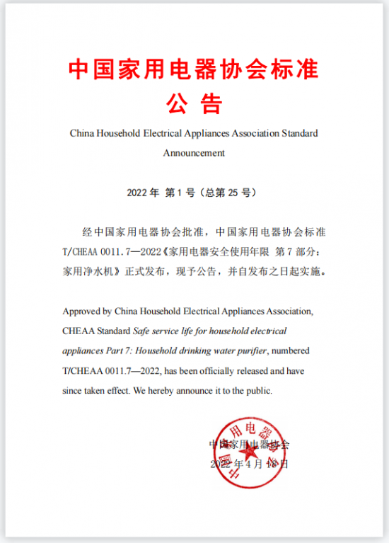 2022年4月18日中國家用電器協會2022年第1號(總第25號)T/CHEAA 0011.7-2022《家用電器安全使用年限 第7部分:家用凈水機》正式發布,并于發布日起開始施行。該標準明確了家用凈水機安全使用年限的術語和定義、要求、正常使用條件、提醒信息等內容。