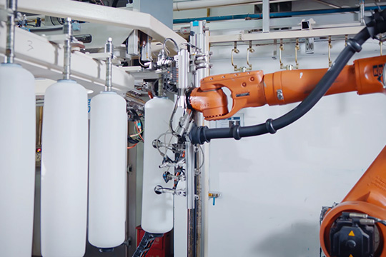 這是世界為數不多的定制化自動生產設備,從塑料原料到復合材料壓力容器,全部自動化生產,達到高質、高量生產水平。